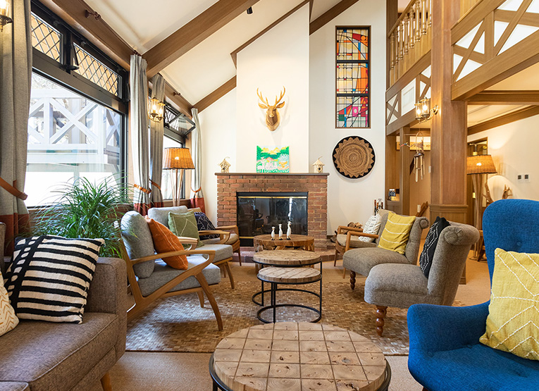 - 吹き抜けが心地よい開放的なラウンジ。